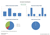 - Main Sheet: Bar graph of the number of occurrences identified by month, bar graph of occurrences by day of the week, pie chart of number of occurrences within 1, 2 or 3 days; pie chart of occurrences by union.