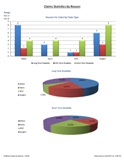- Main sheet: Chart of total claims currently by claim type, pie charts of claim reasons and status. Bar chart of total claims existing by reason and claim type.