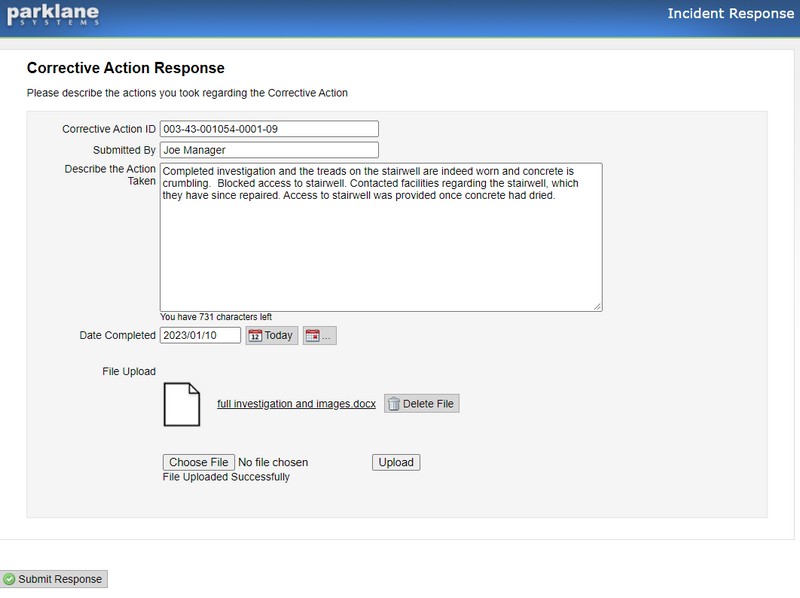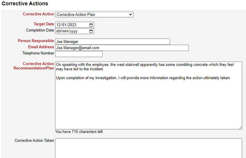 Corrective Actions Update Those with Online Incident Reporting can now send corrective action recommendations or plans at the time of the incident submission. The supervisor, or other person responsible, receives an email with an incident summary and a hyperlink. This hyperlink opens a corrective action response page that allows the supervisor (or other) to respond with the Actions Taken at a later date, as opposed to at the time of the incident submission. With this feature you can: