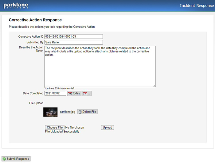 When the email recipient clicks on the hyperlink, the Corrective Action Response page opens where they can enter their name, the action they took and the date it was completed. They can also upload accompanying documents or images with the submission.